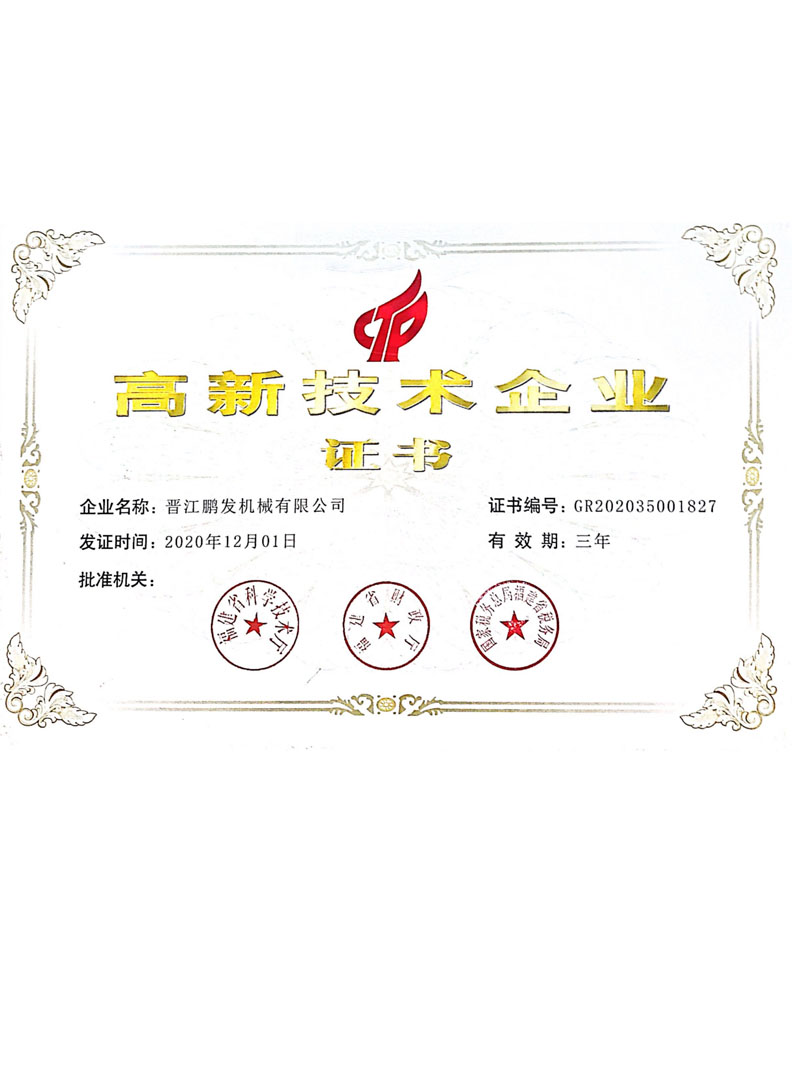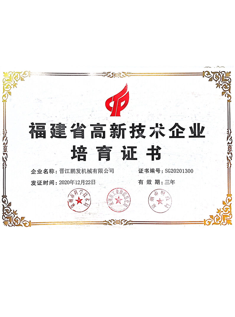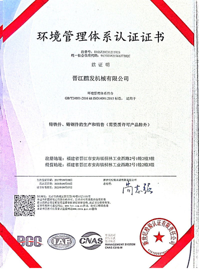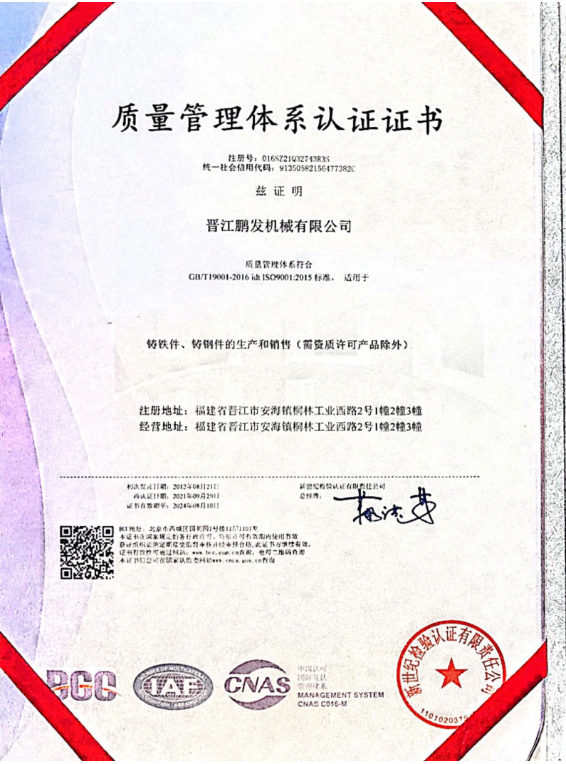 鵬發(fā)機(jī)械鑄造于2012年8月通過質(zhì)量管理體系ISO9001認(rèn)證,2017年通過環(huán)境管理認(rèn)證體系GB/T24001-2016ISO14001認(rèn)證。鵬發(fā)機(jī)械2020年11月通過福建省高新技術(shù)企業(yè),2020年12月通過國家高新技術(shù)企業(yè),且榮獲22年度科技小巨人企業(yè),獲23年創(chuàng)新型中小企業(yè)等榮譽。